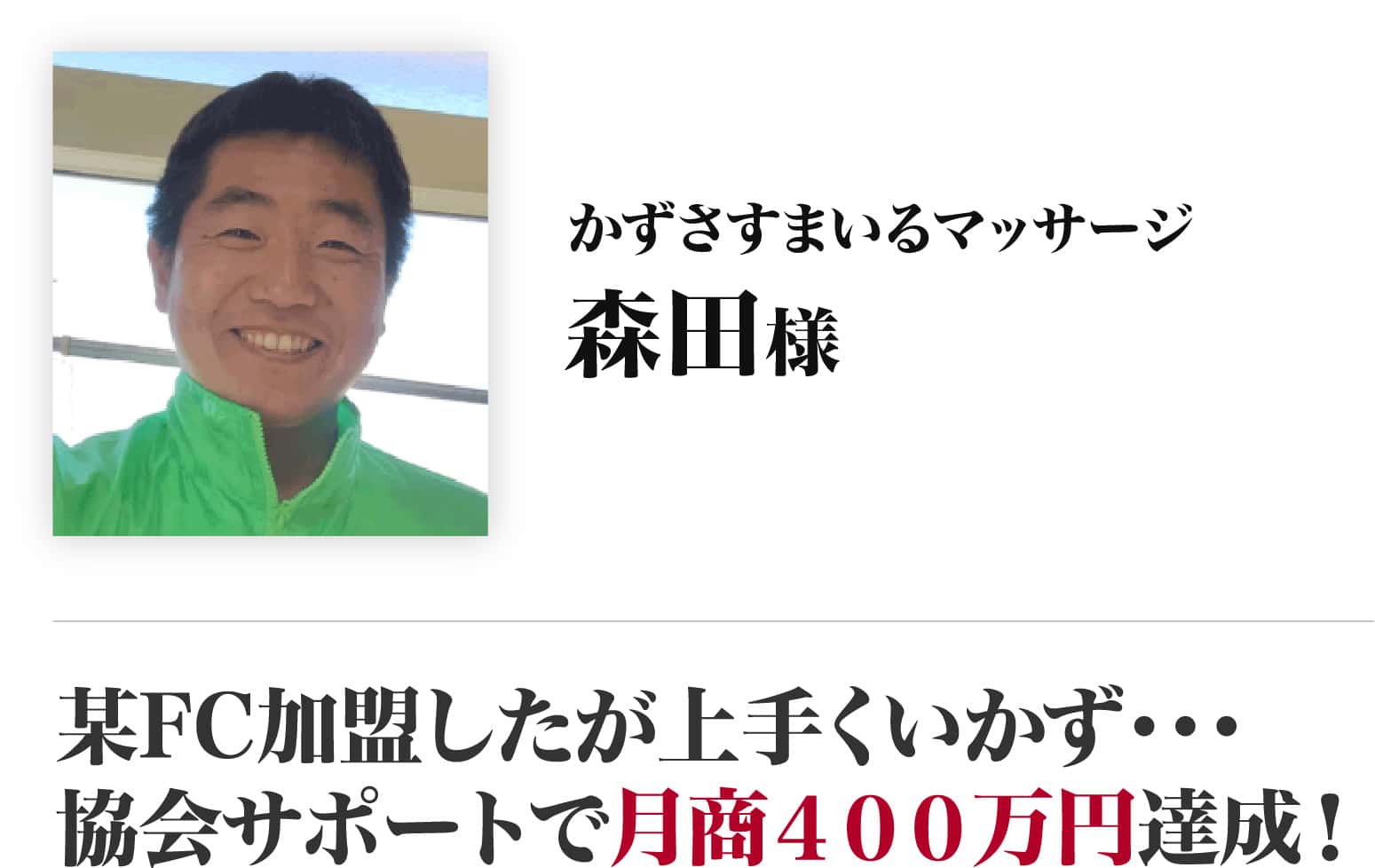 30歳の時にノウハウが一切ない飲食店として独立する際、 FCを利用し独立開店した経緯があるが、本部有利で売り上げを吸い取られるシステムに嫌悪感を抱き3年で脱会しました。 よって、訪問マッサージの開業においても 必然的にFCに加盟するという選択肢はなく、 セミナーでの藤井会長の熱意と協会理念に賛同できました。今回、参入を決断いたしました。 初年度から静岡県内に2店舗展開を目指して頑張ります!