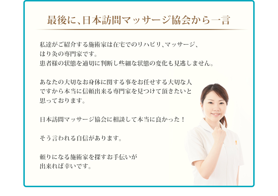 私のように田舎で一人暮らしで、病院まで通えないという悩みを抱えている方は大勢いると思う。こんなマッサージのサービスがあるなんて知りませんでしたので、もっと積極的に宣伝をして困っている方の役に立ってほしい。